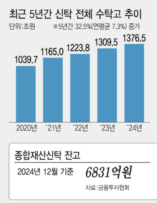 문제는 우리 신탁시장이 은행 등 금융회사가 금융상품 판매를 위한 금전신탁이나 부동산 공급 확대를 위한 부동산신탁 중심으로 발전해왔다는 점이다. 이로인해 전체 신탁 수탁고 1376조 4742억원(2024년 말 기준)에서 금전신탁 631조 7078억원(45.9%)과 부동산 신탁 514조 9997억원(37.4%)이 차지하는 비중이 83.3%에 달한다. 반면 종합재산신탁은 6831억원으로 전체 0.05%에 불과하다.