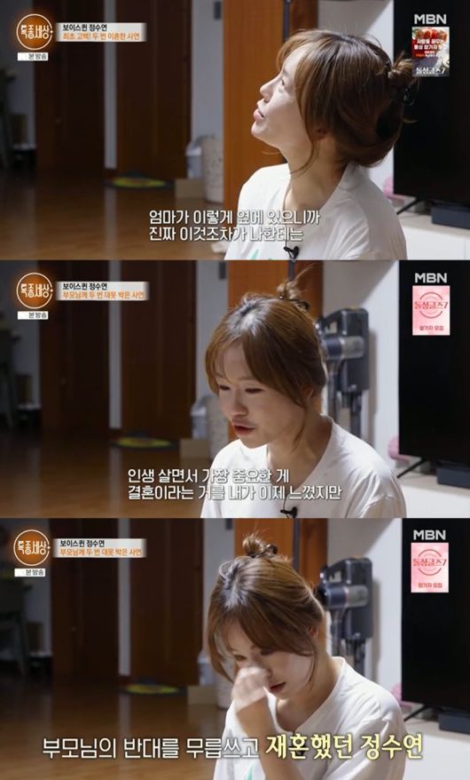 정수연은 "인생 살면서 가장 중요한 게 결혼이라는 거를 내가 이제 느꼈지만, 나는 엄마 아빠가 그냥 평온하게 사는 사람들이기 때문에 결혼생활이 이렇게 심각하고 무서운 거라는 것을 몰랐던 거지"라며 눈물을 흘렸다.