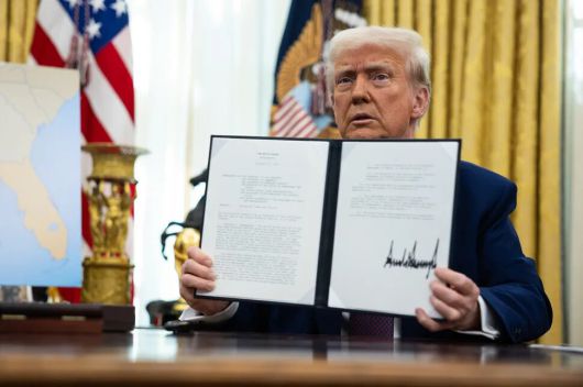 도널드 트럼프 미국 대통령이 13일 백악관 오벌 오피스에서 상호관세 검토를 지시하는 메모랜덤에 서명하고 있다. 워싱턴/UPI 연합뉴스 |