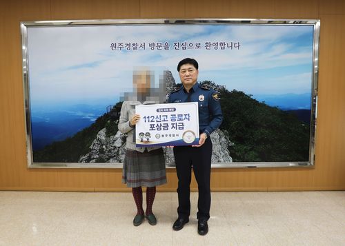 (원주=연합뉴스) 임보연 기자 = 원주경찰서 14일 범죄 예방과 다른 사람의 생명·신체 및 재산을 보호하는 데 이바지한 공이 큰 112신고 공로자에 포상금과 표창장을 수여했다.