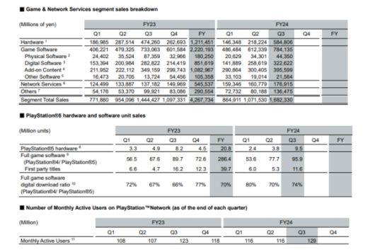 네트워크 서비스 구독자도 역대 최고치를 달성했다. 3분기 플레이스테이션 네트워크(PSN)의 월간 활성 사용자 수는 1억 2900만 명이다. 1억 1800만 명이었던 전년 동기 대비 1100만 명 증가했다.