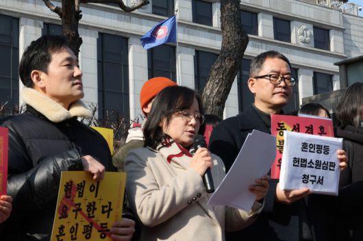 동성결혼을 허용하지 않는 현행 민법의 위헌성 심판을 청구하는 혼인평등 헌법소원이 제기됐다. 성소수자차별반대 ‘무지개행동’과 민주사회를 위한 변호사모임은 14일 서울 종로구 헌법재판소 앞에서 기자회견을 열고 ‘지난달 13일 서울북부지방법원이 동성부부 혼인신고불수리처분불복신청에 대한 각하 및 위헌법률심판제청신청을 기각함에 따라 헌법재판소의 판단을 구하고자 이날 헌법소원을 제기한다’고 밝혔다. 이날 혼인평등소송 조숙현 대리인단장은 “부부로 인정받지 못해 현실적인 피해를 겪고 있는 동성부부들이 하루라도 빨리 구제받을 수 있도록 헌법재판소가 동성간 혼인을 허용하지 않는 민법 규정에 대해 위헌을 선언하기를 바란다”고 밝혔다.