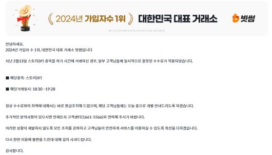 빗썸은 14일 오전 자사 홈페이지를 통해 '정상 수수료와의 차액에 대해 바로 환급 조치를 완료했다'고 공지했다. 전날 오후 6시30분부터 약 1시간 동안 신규 가상자산인 스토리코인 거래 중 수수료 오류가 발생했기 때문이다. 해당 시간 동안 일부 투자자들은 빗썸의 기존 수수료 0.04%의 100배인 4%가 적용됐으며, 거래대금은 약 510억원이다. 현재 오류로 부과된 수수료는 40억원이 넘는 것으로 추정되고 있으며, 빗썸 측에서는 정확한 금액을 공지하지 않고 있다.
