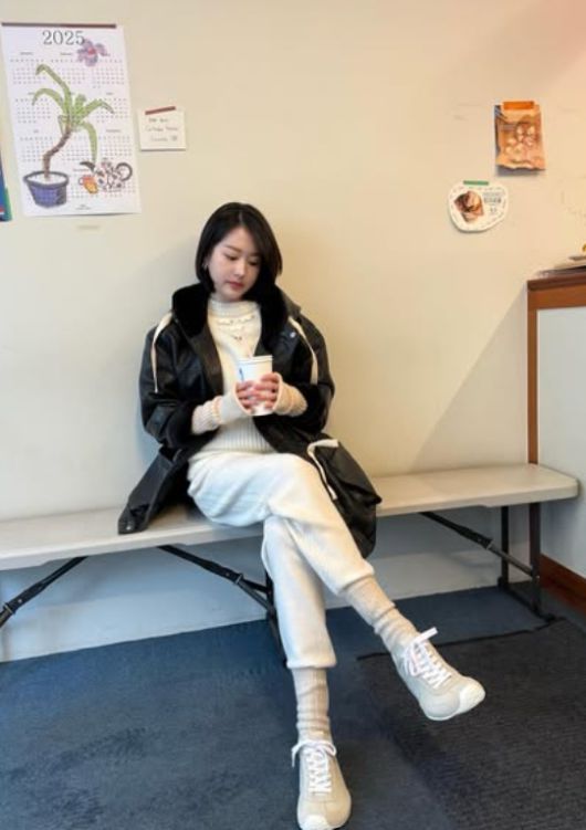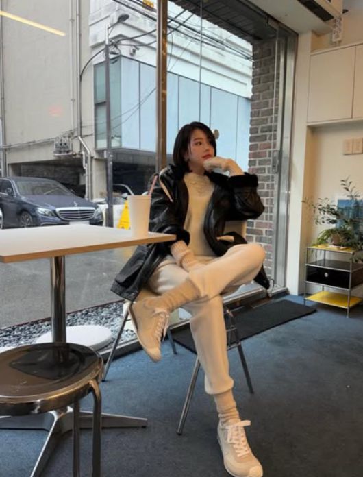 아이보리톤으로 맞춘 상하의와 시크한 하프기장 블랙 점퍼로 편안한 연출로 분위기를 이끌었다.