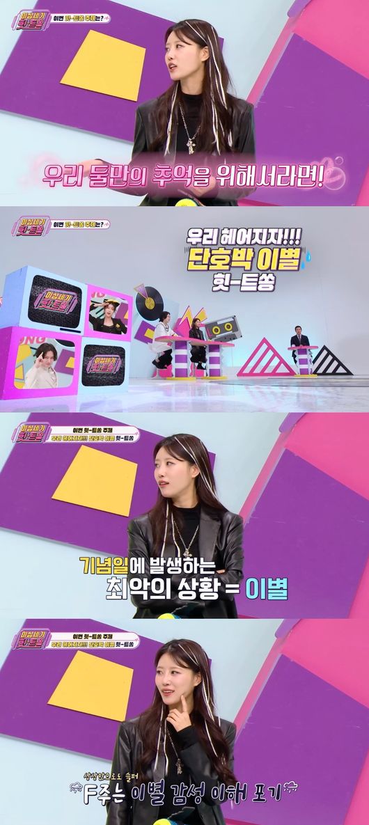 다음으로 이별 히트송이라는 주제가 공개되자 이미주는 "기념일에 헤어지는 것 최악이다"라고 강조했다.