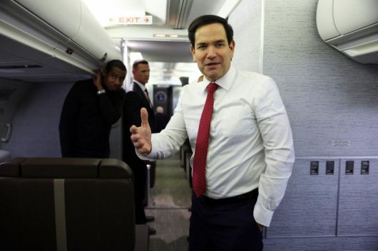 마코 루비오 미국 외교장관이 13일(현지시간) 메릴랜드주 앤드루스 합동기지로 귀환하는 비행기에서 기자들과 대화하고 있다. 루비오 장관은 15일 세르게이 라브로프 러시아 외교장관과 전화회의로 우크라이나 평화협상, 미국의 가자지구 점령, 중동 문제를 비롯해 여러 국제 문제에 관한 양국 협력을 모색하기로 했다. 로이터 연합 |