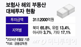 국내 보험사의 해외 부동산 대체투자 금액은 지난해 6월 말 기준 31조2000억원으로 전 금융권의 55%를 차지한다. 이 중 북미 투자 비중이 65.8%로 특정 지역 쏠림이 심하다.