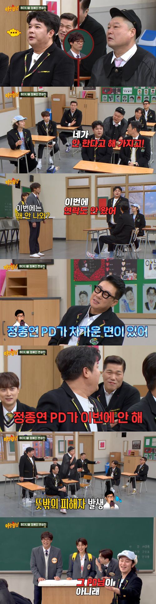 이상민은 "정종연 PD가 약간 차가운 면이 있다"고 했지만, 신동은 "정종연 PD가 이번에 안 해"라고 밝혀 웃음을 자아냈다. 뜻밖의 피해자 발생에 김희철은 "뭘 안다고 저래. 그 피디님이 안 해"라며 웃었고, 서장훈은 "귀신 들렸다"며 놀렸다. 강호동 역시 "진짜 쌩뚱맞다"고 거들었다.