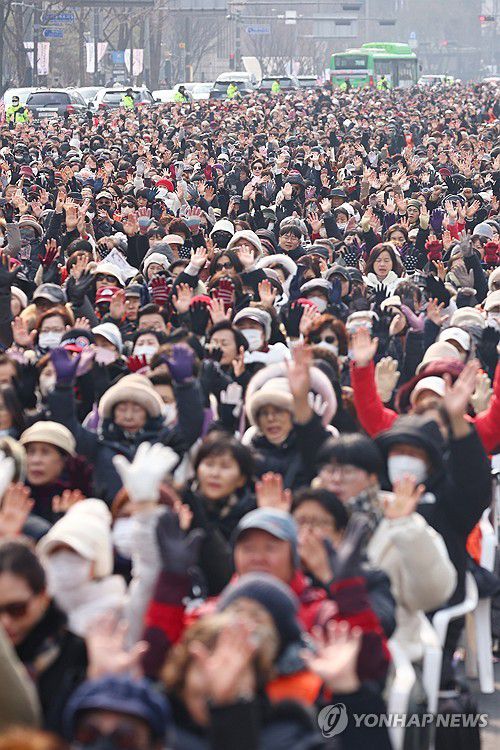 (서울=연합뉴스) 서대연 기자 = 서울 종로구 세종대로에서 열린 광화문 전국 주일 연합예배에서 신도들이 전광훈 사랑제일교회 목사의 발언을 듣고 있다. 2025.2.16
