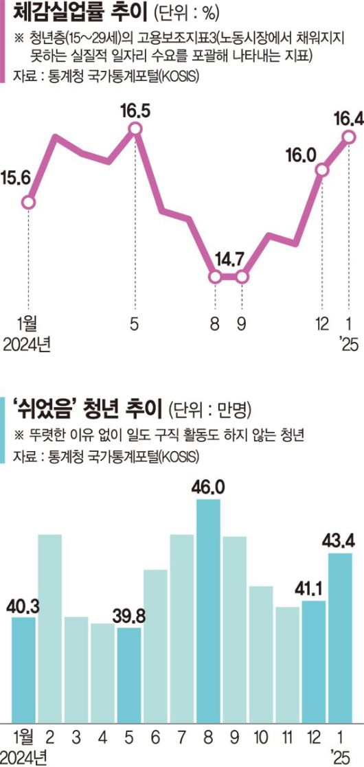 16일 통계청 국가통계포털(KOSIS)에 따르면 지난 1월 청년층의 고용보조지표3(체감실업률)은 1년 전보다 0.8%p 오른 16.4%를 기록했다. 이는 2021년 2월(26.8%)의 3.7%p 이후 3년11개월 만에 가장 컸다. 고용보조지표3은 노동시장에서 채워지지 못하는 실질적 일자리 수요를 포괄해 나타내는 지표다. 피부로 느끼는 고용상황을 보여준다는 의미에서 '체감실업률'로도 불린다. 청년층 실업률은 6.0%로 1년 전과 같았고, 실업자 수는 23만명으로 1만6000명 줄었지만 체감상 어려움이 갑작스레 커졌다는 뜻이다.