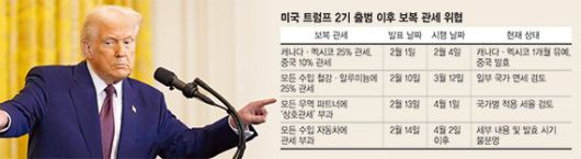 지난달 20일(현지시간) 취임한 트럼프는 이달 1일 마약성 진통제 '펜타닐' 통제를 이유로 멕시코·캐나다·중국에 10~25%의 보복관세를 지시했다. 그는 지난 10일에는 미국에 수입하는 모든 철강·알루미늄 제품에 25%의 관세를 추가한다고 밝혔다. 13일에는 외국이 미국 제품에 부과하는 관세를 따져 이에 상응하는 '상호관세'를 부과한다고 알렸으며, 14일에는 수입 자동차에 새로운 관세를 도입한다고 예고했다. 그는 취임 전 대선 공약으로 해외 모든 수입품에 10~20%의 '보편관세'를 추가한다고 주장했으나 아직 이에 대해 언급하지는 않았다.