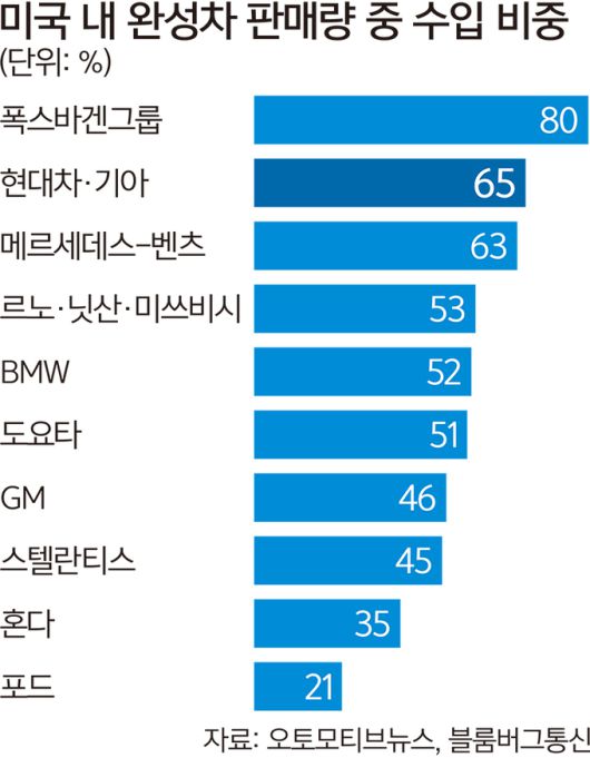 미국 상무부의 승용차 및 경량 트럭 신차 수출입 통계 자료에 따르면 지난해 한국은 미국에 153만5616대(366억4000만달러·약 52조8970억원)를 수출했다. 수출량으로는 멕시코(296만대)에 이어 두 번째로 많은 규모다. 금액으로는 멕시코(785억달러), 일본(397억3000만달러)에 이어 세 번째다.
