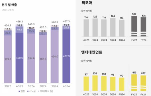 지난해 4분기에도 픽코마와 엔터는 전년동기대비 각각 3%, 8% 역성장했다. 연간 성장은 둔화했지만, 견조한 실적을 지속 중이라는 게 회사 측 설명이다. 카카오 일본 웹툰 서비스 ‘픽코마’의 지난해 연간 거래액은 1000억엔(한화 약 9500억원)을 돌파하며 현지 전체 앱 매출에서 2년 연속 1위를 기록했다.