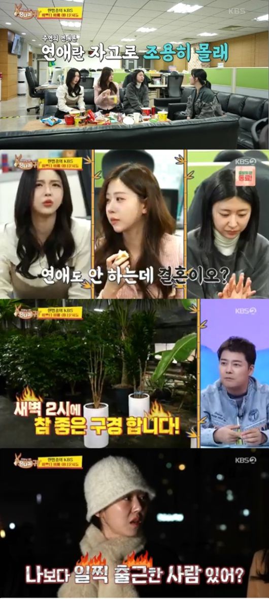 엄지인은 연애에 이어 "대체 결혼은 언제 할 거야"라며 어머니들이 할 법한 잔소리를 후배들에게 쏟아냈다.