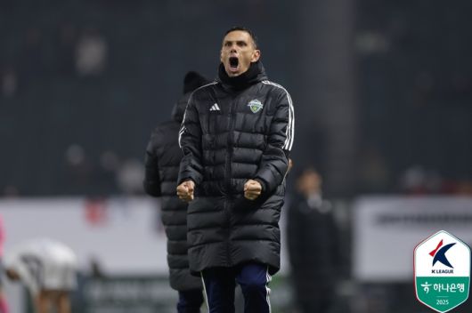 전북 현대 거스 포옛 감독이 16일 전주월드컵경기장에서 열린 김천 상무와의 K리그 개막전에서 포효하고 있다.제공 | 한국프로축구연맹 |