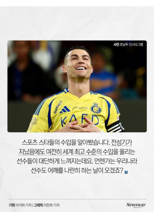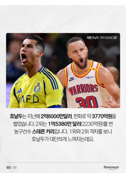 호날두는 지난해 2억6000만달러, 한화로 약 3770억원을 벌었습니다. 2위는 1억5380만 달러(2230억원)를 번 농구선수 스테픈 커리입니다. 1위와 2위 격차를 보니 호날두가 대단하게 느껴지는데요.