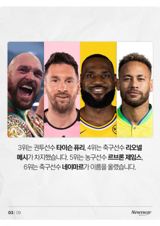 3위는 권투선수 타이슨 퓨리, 4위는 축구선수 리오넬 메시가 차지했습니다. 5위는 농구선수 르브론 제임스, 6위는 축구선수 네이마르가 이름을 올렸습니다.