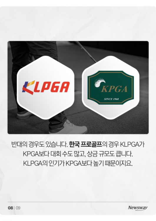 반대의 경우도 있습니다. 한국 프로골프의 경우 KLPGA가 KPGA보다 대회 수도 많고, 상금 규모도 큽니다. KLPGA의 인기가 KPGA보다 높기 때문이지요.