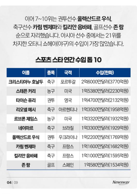 이어 7~10위는 권투선수 올렉산드르 우식, 축구선수 카림 벤제마와 킬리안 음바페, 골프선수 존 람 순으로 자리했습니다. 아시아 선수 중에서는 21위를 차지한 오타니 쇼헤이(야구)의 수입이 가장 많았습니다.