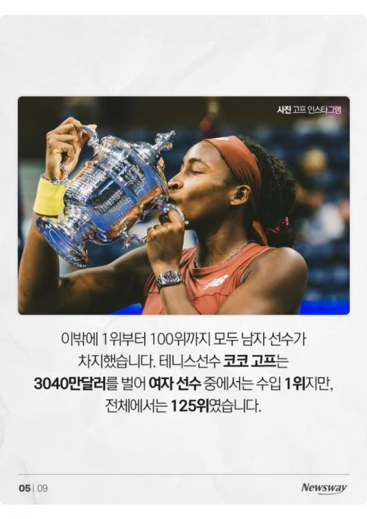 이밖에 1위부터 100위까지 모두 남자 선수가 차지했습니다. 테니스선수 코코 고프는 3040만달러를 벌어 여자 선수 중에서는 수입 1위지만, 전체에서는 125위였습니다.