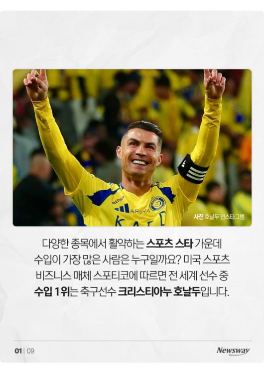다양한 종목에서 활약하는 스포츠 스타 가운데 수입이 가장 많은 사람은 누구일까요? 미국 스포츠 비즈니스 매체 스포티코에 따르면 전 세계 선수 중 수입 1위는 축구선수 크리스티아누 호날두입니다.