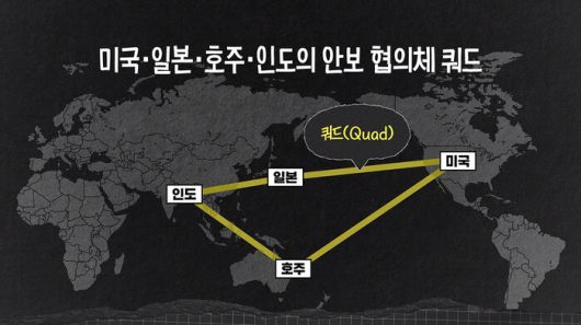 그리고 쿼드(QUAD)라는 거 들어보셨잖아요. 인도, 호주, 일본, 미국인데 이걸 계속 유지하는 원작자가 원래는 아베예요. 아베가 원래 '열린 인도-태평양 전략' 이랬던 걸 트럼프가 괜찮다 그래서 중국 압박 전략으로 그거를 마지막에 했고, 이거 가지고 조금 부족하다고 생각한 바이든이 '오커스'라는 걸 만든 거예요. 오스트레일리아, 영국, 이렇게 셋이.