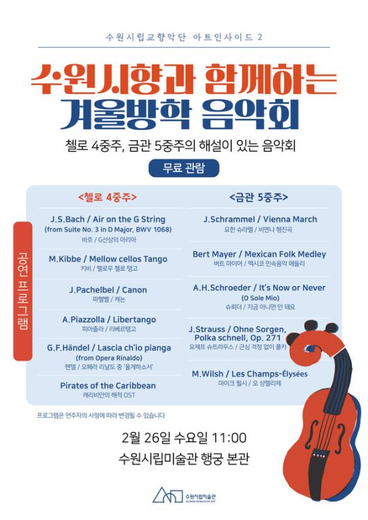 오전 11시에는 수원시립교향악단 아트인사이드 2 '수원시향과 함께하는 겨울방학 음악회'가 무료로 개최된다. 첼로 4중주와 금관 5중주의 해설이 있는 음악회로 바흐의 'G선상의 아리아', 피아졸라의 '리베르 탱고', 캐리비안의 해적 OST 등 익숙한 곡들이 해설과 함께 연주된다.