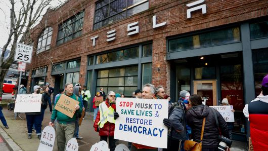 50501이 조직한 시위와는 별도로, 지난 15일에는 머스크를 비판하는 시위가 뉴욕, 시애틀, 캔자스시티, 그리고 캘리포니아의 여러 도시 등 미국 곳곳의 테슬라 전시장에서 열렸습니다.