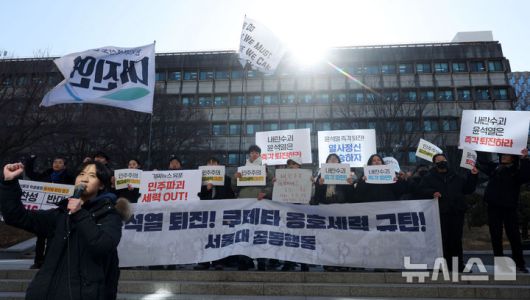 [서울=뉴시스] 홍효식 기자 = 17일 서울 관악구 서울대학교 아크로광장에서 열린 윤석열 퇴진! 쿠데타 옹호세력 규탄! 긴급 서울대 2차 공동행동에서 참가자들이 구호를 외치고 있다. 2025.02.17. yesphoto@newsis.com