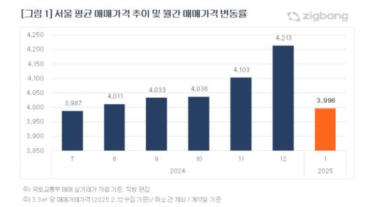 17일 부동산 플랫폼 업체 직방이 국토교통부 실거래가 자료를 분석한 결과, 1월 서울 아파트 평균 매매거래가격은 3.3㎡당 3996만원으로 전월 대비 5.2% 하락한 것으로 나타났다.