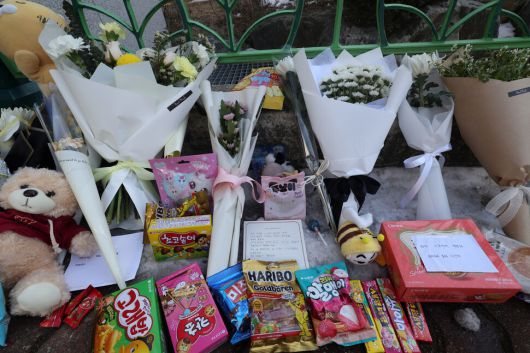 대전 서구의 한 초등학교에서 교사가 휘두른 흉기에 8살 김하늘양이 숨진 다음날인 지난 11일 오후 학교 앞에 김양을 추모하는 간식과 조화, 쪽지가 놓여 있다. 김영원 기자 forever@hani.co.kr |