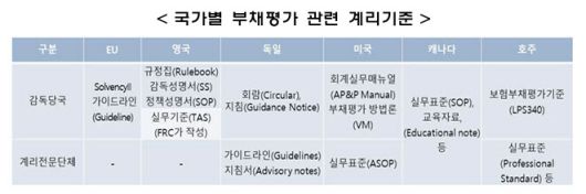 구체적으로 살펴보면 영국, 독일, 미국 감독 당국은 부채평가에 대한 법규·가이드라인을 직접적으로 제시한다. 계리전문단체가 이에 대한 추가 설명을 제공한다. 노건엽 보험연구원 실장은 “조사대상국 모두 보험 감독 당국과 회계 감독 당국 외 기타 기관에서는 재무건전성 평가를 위한 회계·일반회계에 적용되는 부채평가 기준을 추가로 제시해 평가기준 실효성을 확보하고 있다”며 “계리사회에서 실무표준을 작성하면 내부 규제에 반영해실무표준 실효성을 확보했다”고 분석했다.
