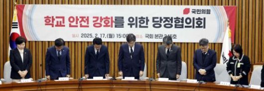 권성동 국민의힘 원내대표와 이주호 사회부총리 겸 교육부 장관이 17일 국회에서 열린 학교 안전 강화를 위한 당정협의회에 앞서 고 김하늘양을 추모하는 묵념을 하고 있다. 2025.2.17 김현민 기자 |