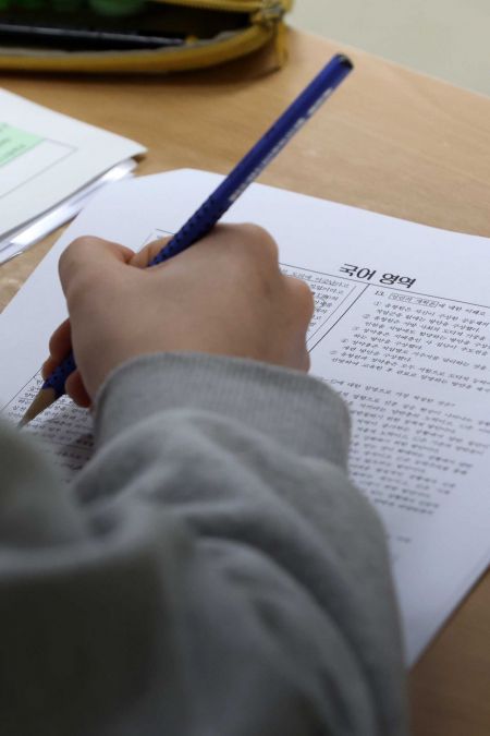 한 수험생이 시험 시작에 앞서 막바지 공부를 하고 있다. 사진=사진공동취재단 |