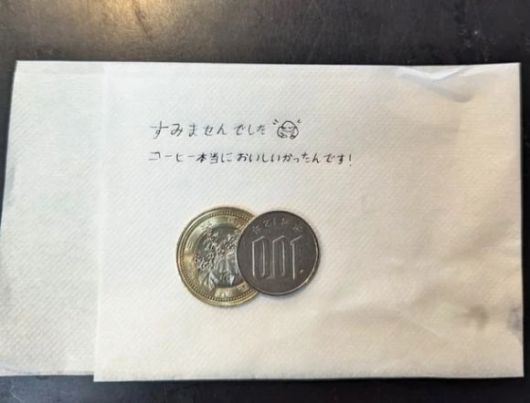 테이블 위에는 카페라테 한 잔 가격인 600엔(한화 약 5700원)이 티슈 위에 가지런히 놓여있었다. 티슈에는 ‘죄송했습니다. 커피 정말 맛있었어요!’라는 메모가 일본어로 적혀있었다.