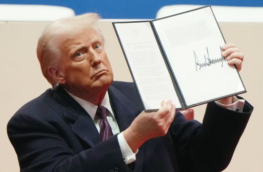 도널드 트럼프 미국 대통령이 취임일인 1월 20일(현지시각) 행정명령에 서명한 뒤 기념촬영을 하고 있다. / AP연합 |