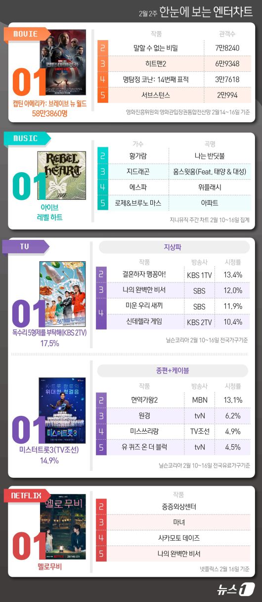 ◇ 지상파=KBS 2TV '독수리 5형제를 부탁해! 1위(닐슨코리아 2025년 2월 10~16일 전국 가구 기준)