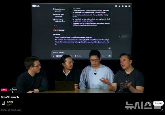 [서울=뉴시스] 일론 머스크(맨 오른쪽)가 이끄는 인공지능(AI) 기업 xAI가 18일 오후 1시께 xAI 공식 홈페이지를 통해 새 AI 챗봇 모델 '그록(Grok)3' 공개 라이브 방송을 진행했다. (사진=xAI 홈페이지 캡처) |