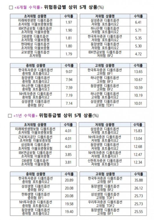 6개월 기준으로는 초저위험은 '미래에셋생명 디폴트옵션 초저위험 이율보증형보험'(1.97%), 저위험은 '삼성증권 디폴트옵션 저위험 포트폴리오2'(6.41%), 중위험은 '한국투자증권 디폴트옵션 중위험 포트폴리오2'(9.07%), 고위험은 '한국투자증권 디폴트옵션 고위험 BF1'(13.65%)가 각각 1위였다.