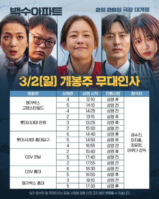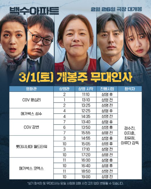 영화 ‘백수아파트’의 주역들이 3월 1일(토), 2일(일), 3일(월)에 진행되는 무대인사를 통해 관객들과 직접 만난다. 먼저, 경수진, 이지훈, 최유정, 이루다 감독은 3월 1일(토)에는 CGV 왕십리, 메가박스 성수, CGV 강변, 롯데시네마 월드타워, 메가박스 코엑스를 방문한다. 이어 3월 2일(일)에는 메가박스 고양스타필드를 시작으로 롯데시네마 은평, 롯데시네마 홍대입구, CGV 연남, CGV 홍대, 메가박스 홍대까지 다양한 극장을 찾아 관객들에게 감사의 인사를 전할 것을 예고했다. 3월 3일(월)에는 메가박스 목동, CGV 영등포, 롯데시네마 영등포, CGV 여의도, CGV 용산아이파크몰을 방문해 열혈 팬서비스를 선사할 예정이다. 특히, 이날 진행되는 무대인사에는 제작에 참여한 마동석이 초특급 스페셜 게스트로 함께하는 것을 비롯, 정희태, 박정학, 차우진, 배재영 등 빛나는 연기력으로 ‘백수아파트’를 빈틈없이 채워준 배우들이 총출동해 극장을 찾은 관객들에게 더욱 풍성하고 즐거운 시간을 선사할 것으로 기대를 모은다.