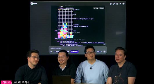 일론 머스크(오른쪽) 테슬라 최고경영자(CEO)와 xAI 개발자들이 17일(현지시간) ‘그록3’가 즉석에서 테트리스 게임을 만드는 것을 시연하고 있다. 출처 xAI 엑스 라이브 캡처 |