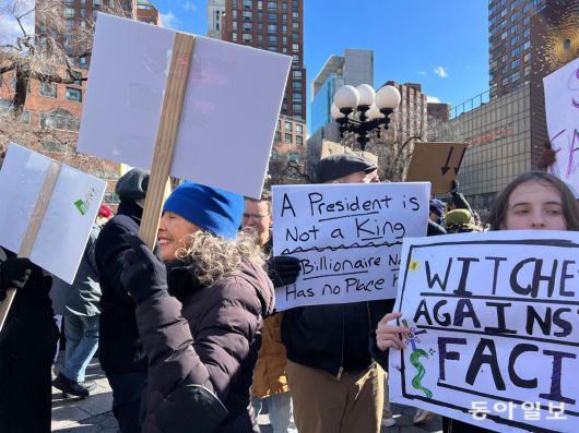 17일 오후 1시 미국 뉴욕 맨해튼 유니언스퀘어 광장. 공휴일인 ‘대통령의 날(Presidents’ Day)’을 맞아 1000여 명의 시민들로 광장이 가득 찼다. 이들은 체감온도 영하 10도의 한파 속에서도 각자 만들어온 수백 개의 피켓을 들고 박자에 맞춰 “노 트럼프!”를 외쳤다. “민주주의를 보여 달라”는 시민들의 구호는 3시간 넘게 이어졌다. 미 연방정부는 초대 대통령인 조지 워싱턴의 생일(2월 22일)을 기리기 위해 매년 2월 셋째 주 월요일을 ‘대통령의 날’(공휴일)로 지정하고 있다.