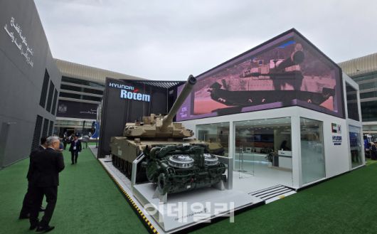 현대로템이 17일 UAE 아부다비 국립전시센터에서 개막한 ‘IDEX 2025’에서 외부 전시장에 부스를 꾸리고 실제 K2전차와 국산 파워팩을 전시하고 있다. (사진=김관용 기자) |