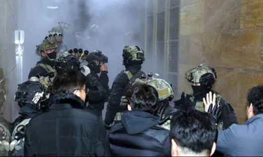 윤석열 대통령이 긴급 대국민 담화를 통해 비상계엄을 선포한 직후인 지난해 12월4일 새벽 서울 여의도 국회 내부로 계엄군이 진입하자 보좌진들이 소화기를 뿌리며 막아서고 있다. 뉴시스 |