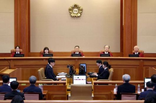 문형배 헌법재판소장 권한대행을 비롯한 재판관들이 18일 서울 종로구 헌법재판소에서 열린 윤석열 대통령 탄핵심판 9차 변론기일에 참석하고 있다. 2025.2.18. 사진공동취재단 |