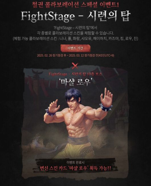 컬래버레이션 기념 스페셜 이벤트도 열린다. 파이트 스테이지 시련의 탑에서 유저들은 각 층별로 컬래버레이션 스킨을 체험할 수 있다. 이때 10층 보스인 마샬 로우를 처치하면 보상으로 변신 스킨 카드 '마샬 로우'를 무료로 획득 가능하다.