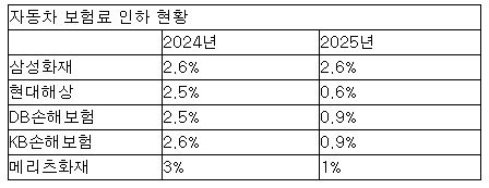 작년에는 메리츠화재를 제외하고는 삼성화재, DB손보, 현대해상은 모두 2%대 인하율로 차이가 거의 없었지만 올해는 자동차 보험료 인하율이 2%대에서 1%대로, 0.6~1%대로 손보사 별로 인하율 차이가 나타났다. 작년에는 메리츠화재 3%를 제외하고 삼성화재 2.6% 현대해상 2.5% KB손해보험 2.6%, DB손보 2.5%로 거의 동일했다.