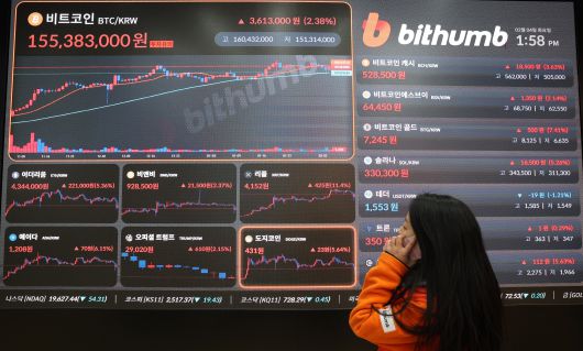 서울 서초구 빗썸라운지 전광판에 비트코인 등 가상자산 시세가 표시되고 있다. /뉴스1 |