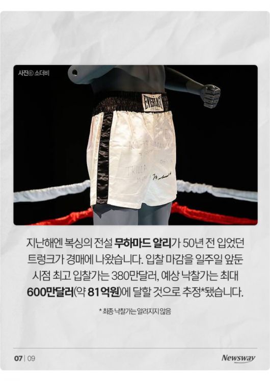 지난해엔 복싱의 전설 무하마드 알리가 50년 전 입었던 트렁크가 경매에 나왔습니다. 입찰 마감을 일주일 앞둔 시점 최고 입찰가는 380만달러, 예상 낙찰가는 최대 600만달러(약 81억원)에 달할 것으로 추정됐습니다.