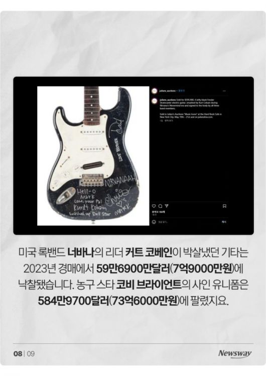 미국 록밴드 너바나의 리더 커트 코베인이 박살냈던 기타는 2023년 경매에서 59만6900만달러(7억9000만원)에 낙찰됐습니다. 농구 스타 코비 브라이언트의 사인 유니폼은 584만9700달러(73억6000만원)에 팔렸지요.